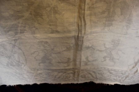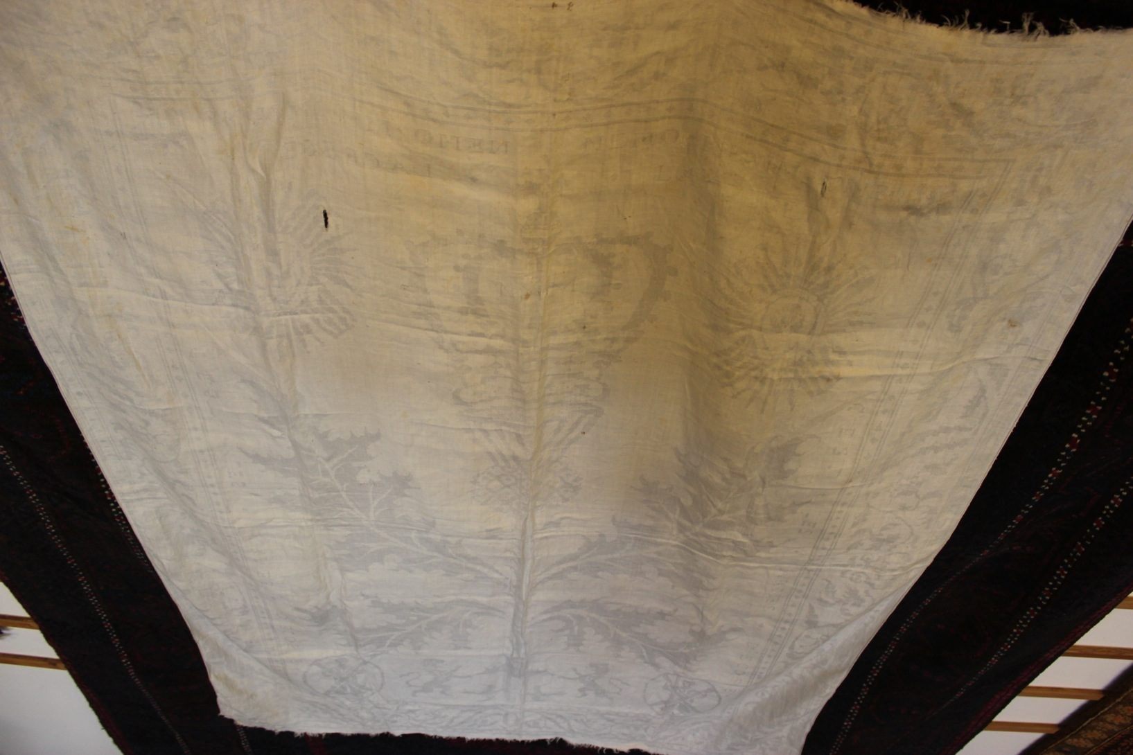 Ancient Damask Linen showing the Scots thistle with the crown above. Text down each side reads in French “Cest Les Armes D,Ecosse” (The coat of arms of Scotland) Across the top in Latin “Nemo-Me-Impune-Lacessit” (No one provokes me with impunity) This is The Royal Stewart Motto. This really should be in a museum as it is 300 years old, maybe more…….. P.O.A. *It is not sold and is available*