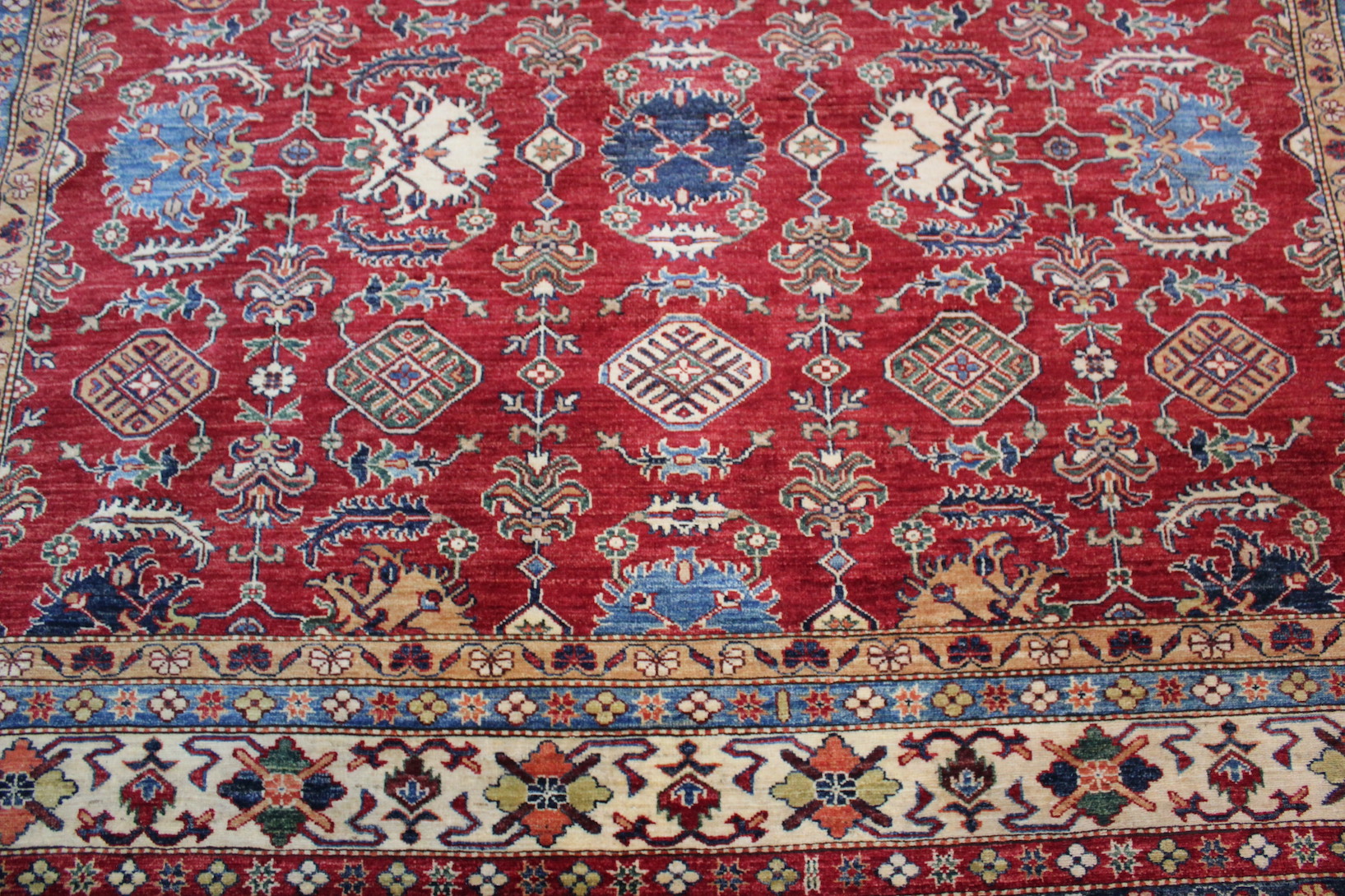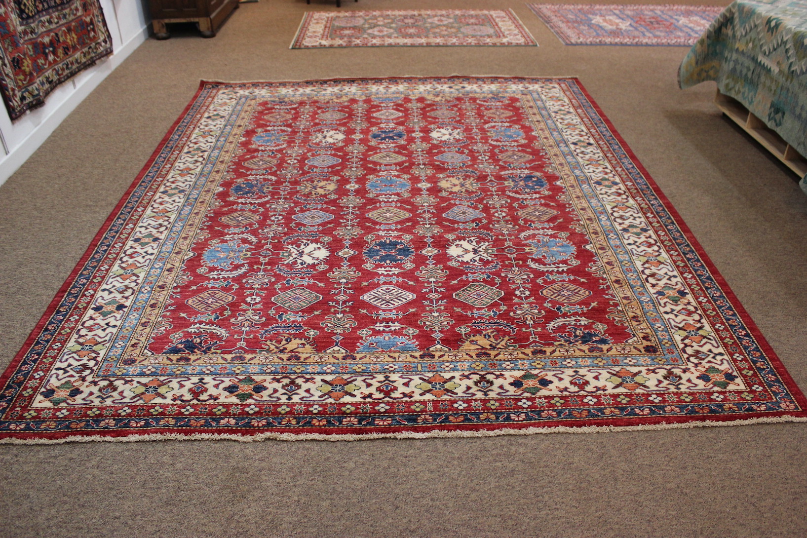 Just arrived this beautiful large size Kazak rug with a red field.
